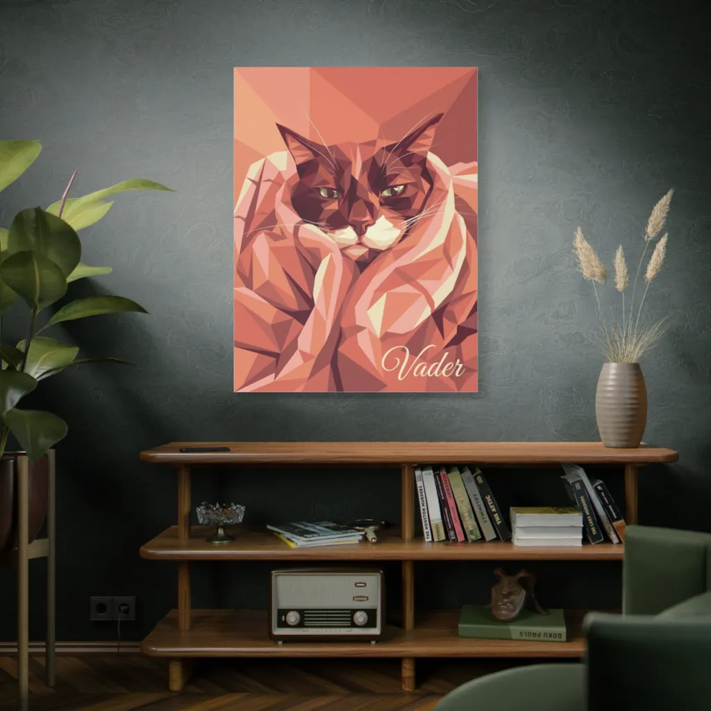 Vader's grumpy glare and blanket-wrapped dignity perfectly capture his formidable yet beloved soul. The geometric styling emphasizes his unique character and cherished presence. Truly special!