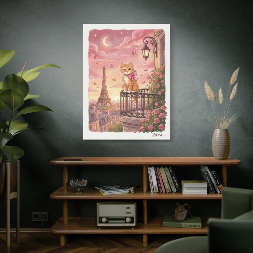 A darling cat surveys a dreamy, pastel Paris sunset from its rose-draped balcony, evoking pure whimsical romance.