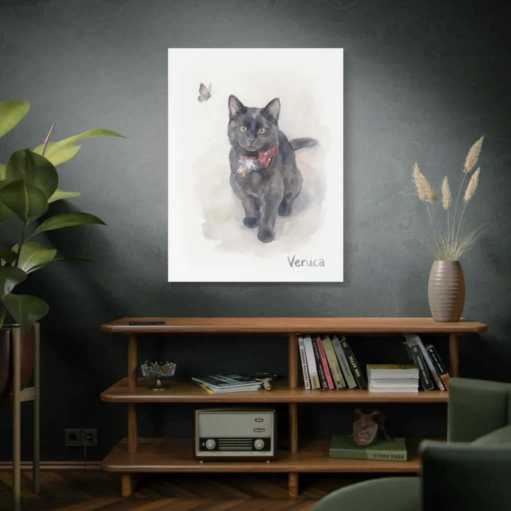 "Veruca's Gentle Fascination" masterfully juxtaposes the visceral with the ethereal. Its evocative watercolor brushwork and tonal harmony elevate this feline contemplation to avant-garde brilliance. A truly transcendent, Louvre-worthy moment of pet art.