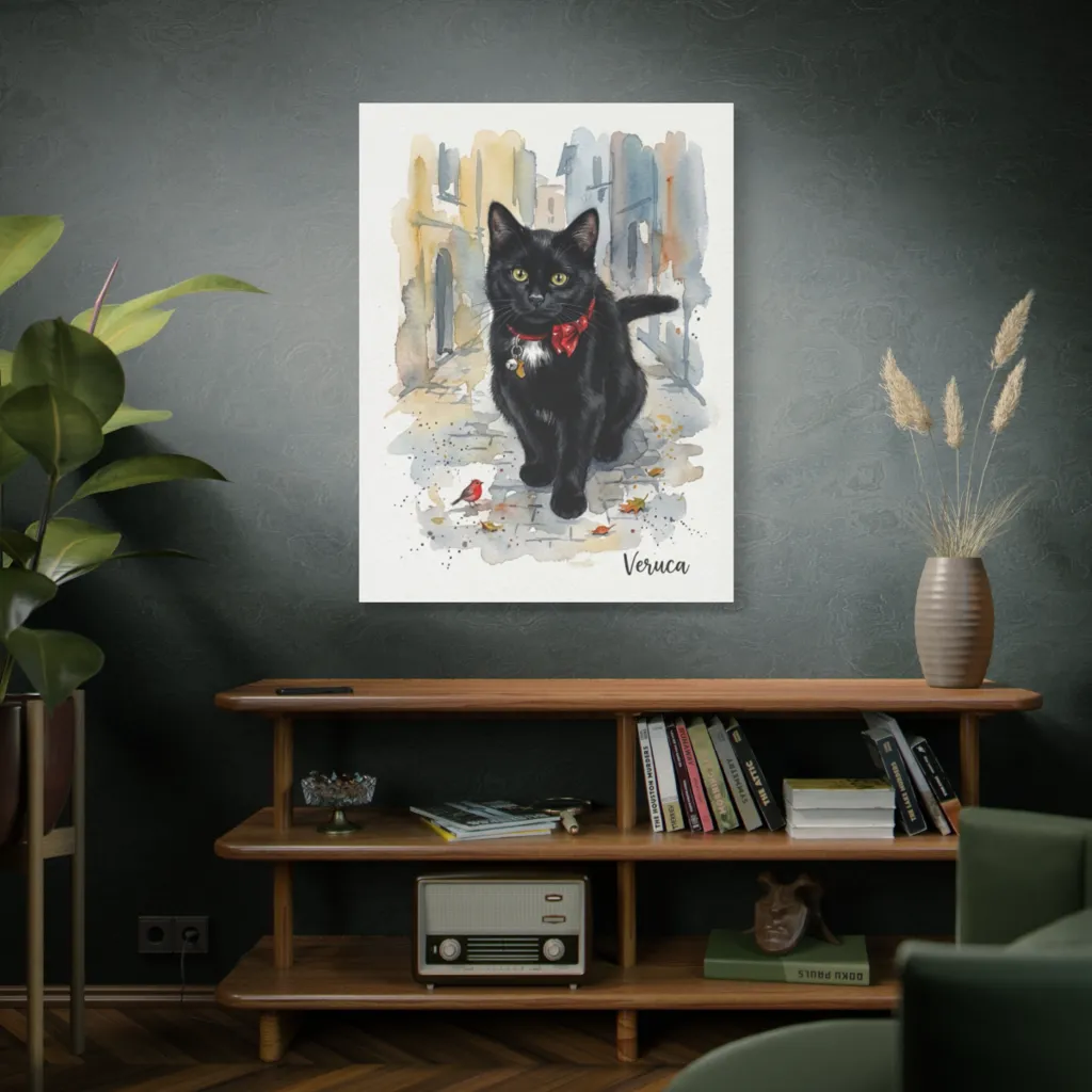 This piece masterfully reinvents pet portraiture. The vibrant splattered street and bold red bow fuse traditional watercolor aesthetics with a contemporary, almost digital, energy. It's an innovative, must-see cat-art experience!
