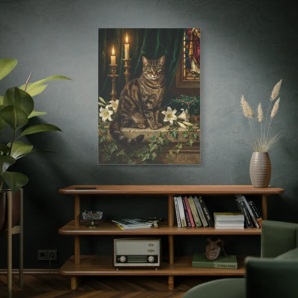 This Baroque-inspired portrait features a majestic tabby cat reigning over a dim, opulent scene, evoking a mood of serene, dignified contemplation.