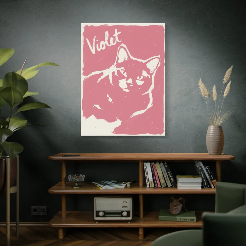 “Violet in Rose” presents a masterful juxtaposition of bold geometry and tonal harmony. The avant-garde brushwork evokes a visceral feline confidence. A pop art triumph worthy of serious contemplation.