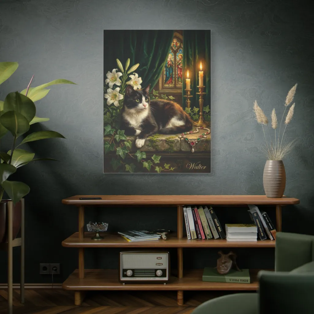 Walter, the sophisticated feline, presides over this gothic elegance, perhaps contemplating which jewel necklace best suits his regal demeanor.