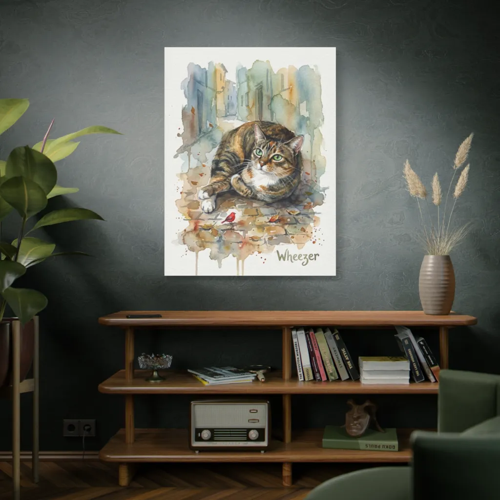 "Wheezer's Cobbled Reverie" masterfully fuses traditional feline portraiture with digital watercolor artistry. Its painterly depth and vivid emerald gaze showcase innovative, captivating storytelling. Bold and brilliant!