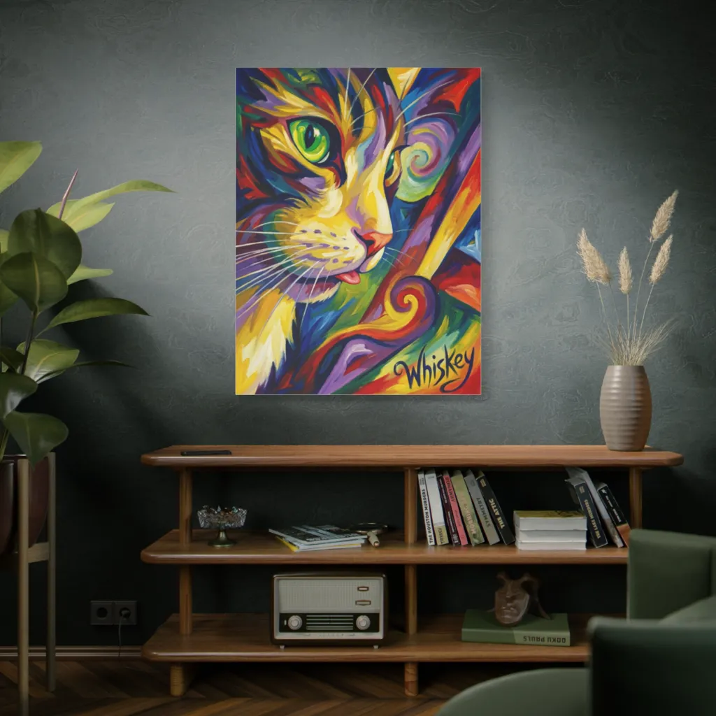 "Whiskey's Emerald Gaze" presents a masterful juxtaposition of psychedelic brushwork and geometric whimsy. The visceral tonal harmony evokes an avant-garde feline apotheosis. Truly, a Louvre-worthy pet portrait.