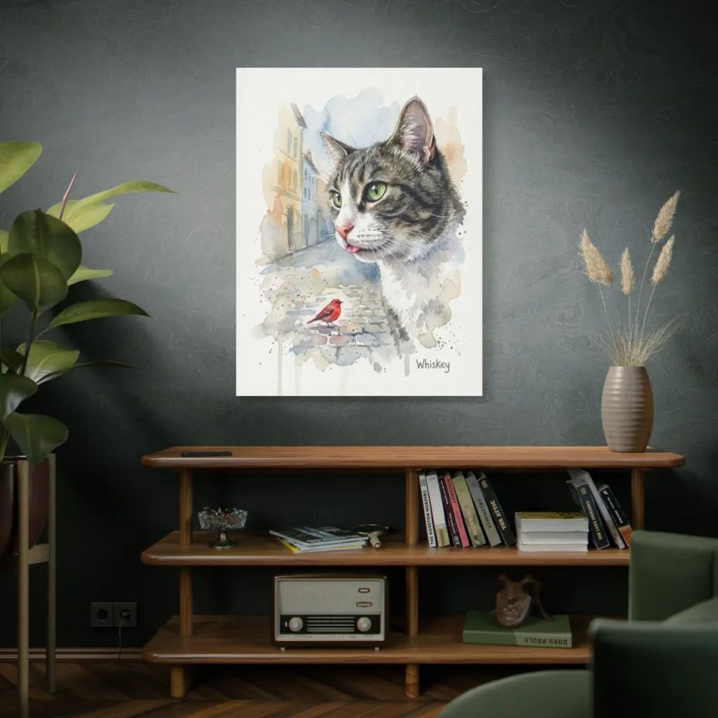 "Whiskey's Gentle Curiosity" offers an avant-garde juxtaposition of feline grace and urban mundanity. The tonal harmony and bold brushwork transform this cheeky tongue into an evocative, almost visceral, statement on existence. Genius!