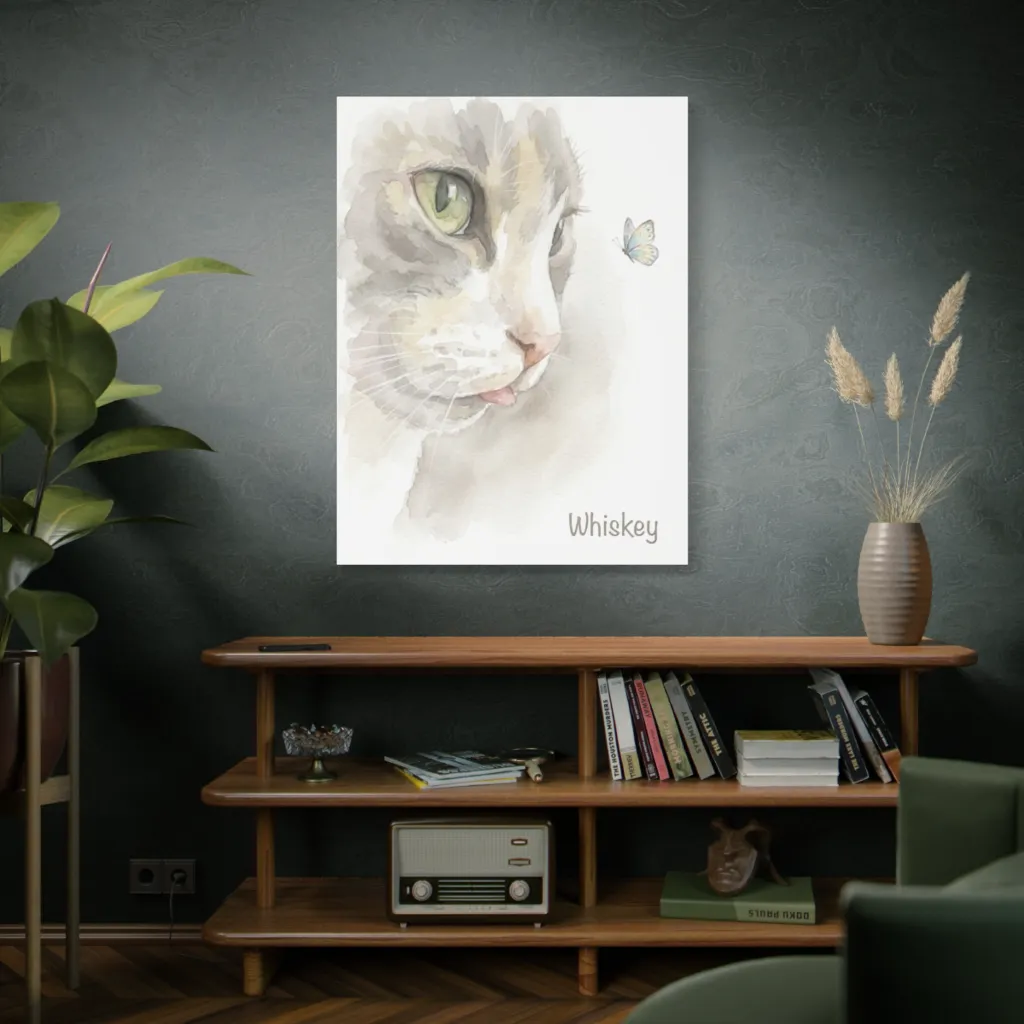 Gentle watercolors capture a curious cat's blep, entranced by a tiny butterfly, creating a delightfully whimsical moment. Whiskey the cat, with a charming blep, is clearly contemplating a most sophisticated butterfly pursuit.
