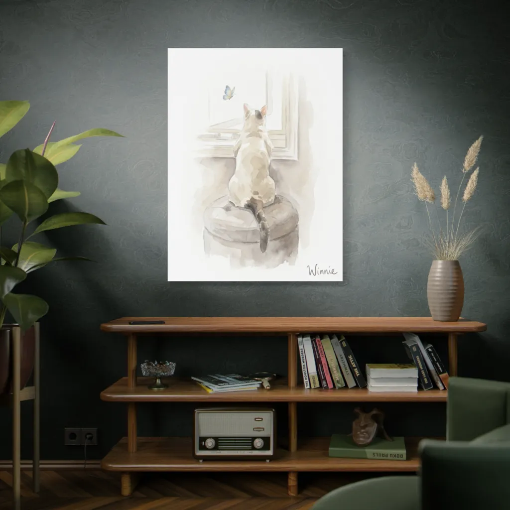 This soft watercolor captures a contemplative cat mesmerized by a butterfly outside, evoking a serene and gentle curiosity. Winnie, with a glint in her eye, plots her next great butterfly adventure from her sun-drenched perch.