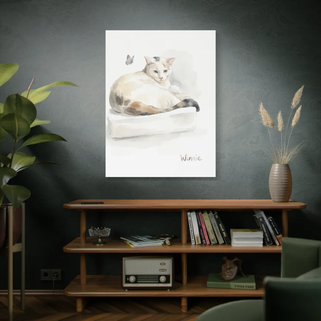 Ethereal watercolors capture a regal calico and a playful butterfly, crafting a charmingly tranquil scene of feline contemplation.