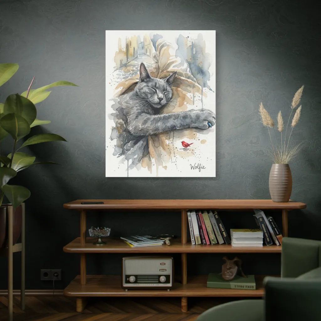 Cool urban washes beautifully harmonize with Wolfie’s serene repose. The complementary blue claw and red bird provide essential chromatic contrast and emotional warmth, perfectly capturing playful serenity. Exquisite saturation balance!