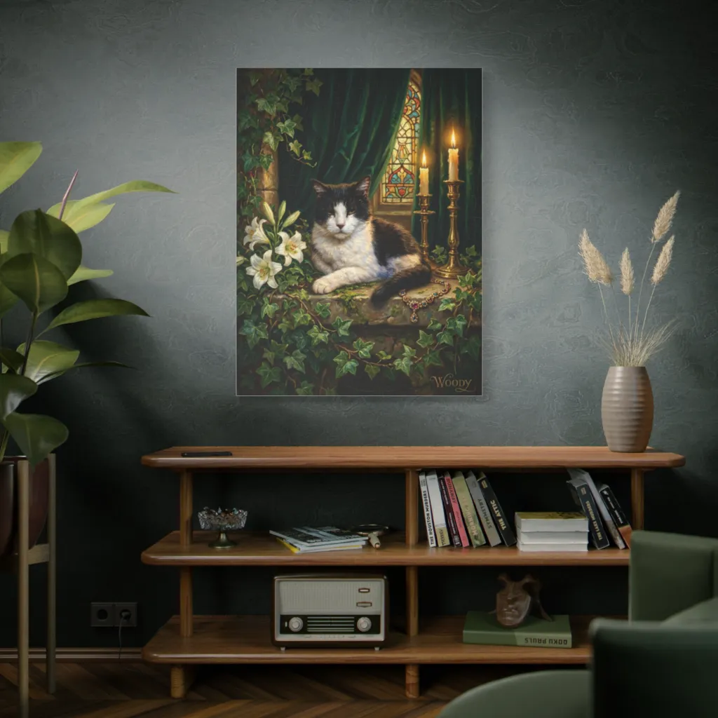 This piece commands attention with its majestic composition and subject's compelling presence. Echoing a Pre-Raphaelite richness, Woody's opulent domain merits immediate exhibition. A masterful study in feline grandeur.