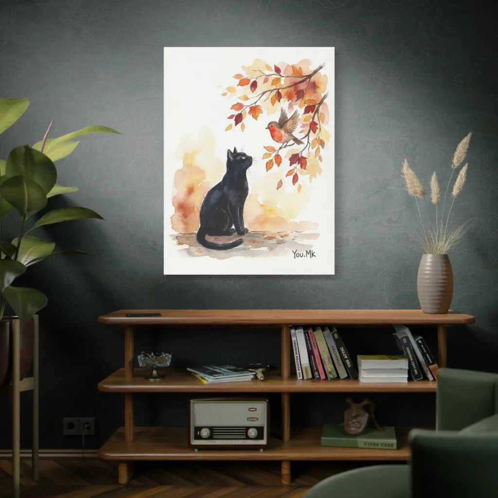 The vibrant robin’s primary red pops against the black cat’s cool depth, balanced by warm autumn ochres. A masterful chromatic harmony, its saturation perfectly evokes whimsical curiosity and peaceful contemplation. Pure color genius!