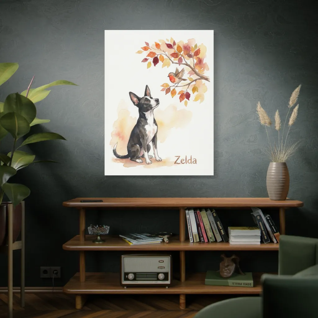 Soft watercolors capture a sharp-eared pup's upward gaze at a vivid robin perched on warm autumnal branches, evoking gentle, curious wonder.