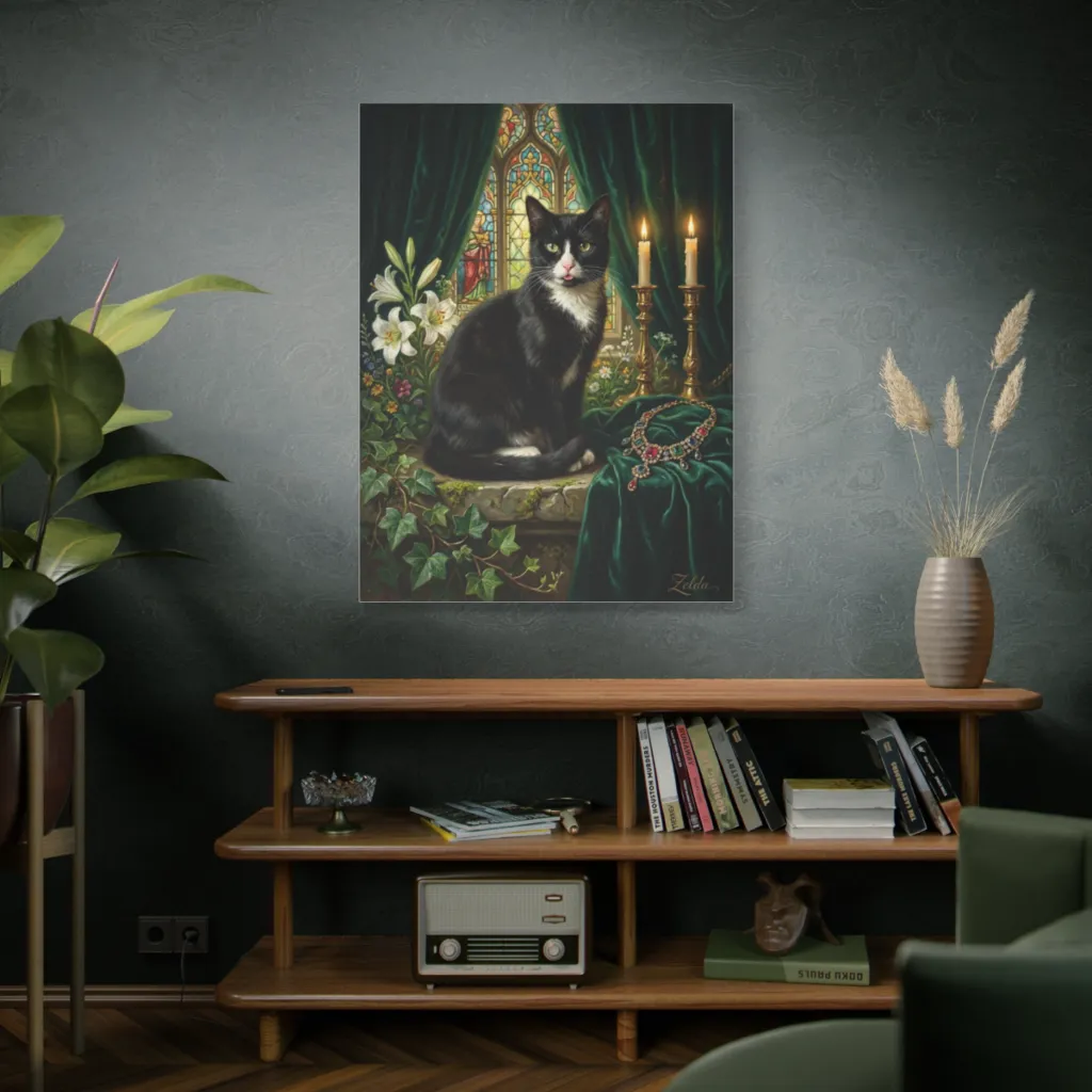 A lavish, Old Master-style portrait presents a regal tuxedo cat, playfully surveying its opulent, candlelit sanctuary with knowing grace.
