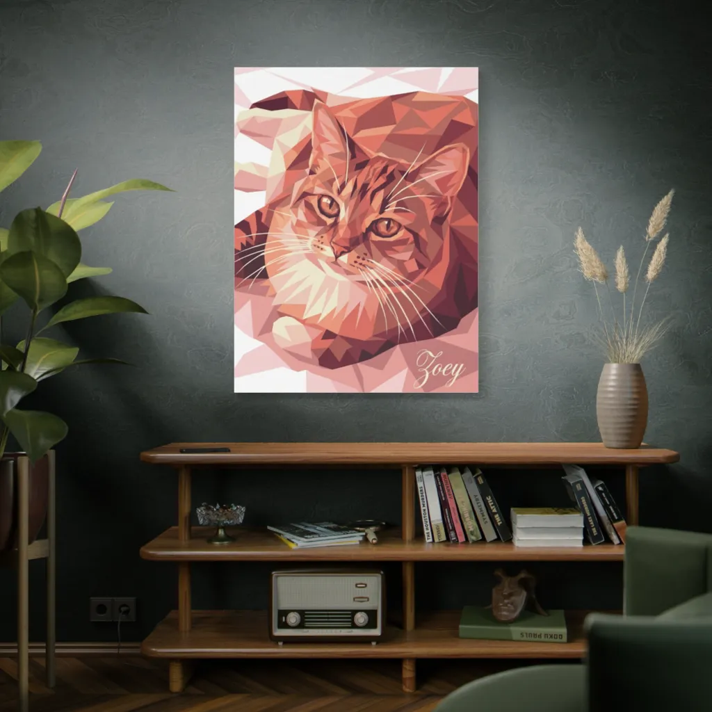 This digitally faceted portrait renders a watchful tabby in warm, geometric glory, radiating a charming, modern mood.