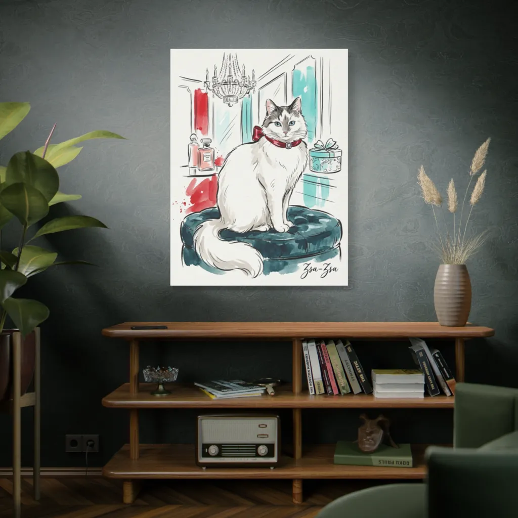 Zsa-Zsa's masterful composition, reminiscent of Rococo portraits, commands attention. Her opulent repose possesses an undeniable presence, worthy of a prestigious salon. A truly discerning study in feline grandeur.