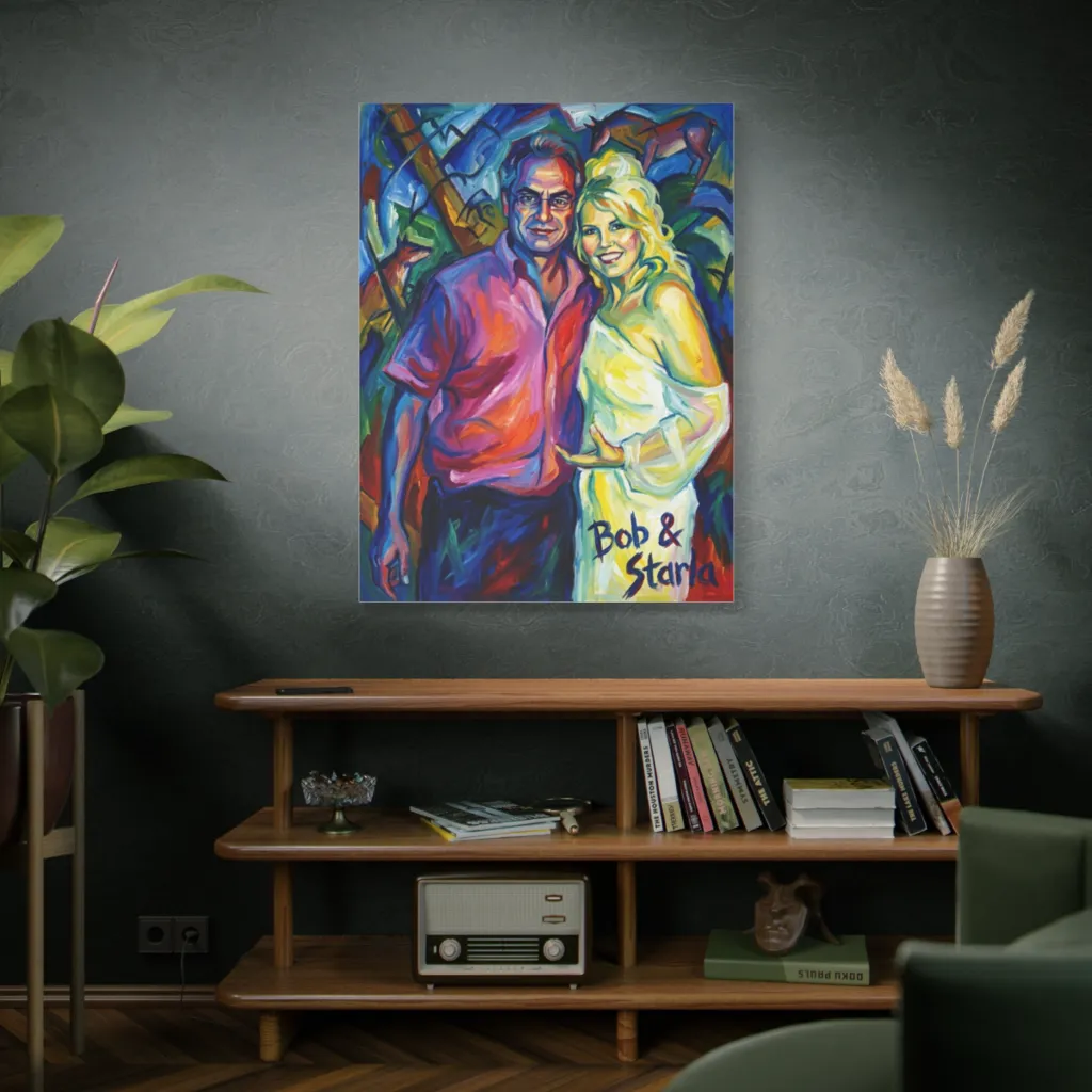 A couple's vibrant, joyful portrait rendered with energetic brushstrokes and a fragmented, colorful background, buzzing with playful intensity. Bob and Starla clearly radiate joy, proving that love—and a riot of color—can conquer even the wildest of abstract backdrops!