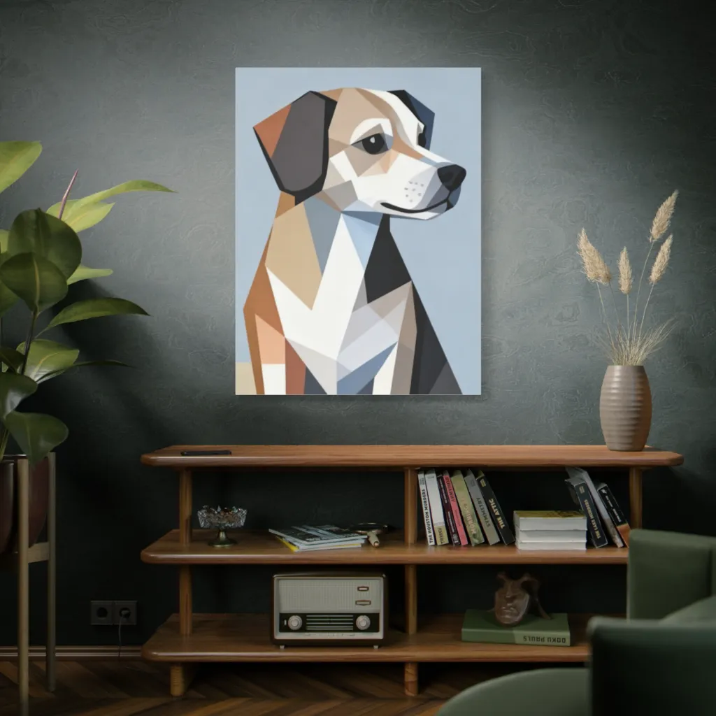 Sharp angles carve a gentle, geometric dog, capturing a quietly thoughtful and subtly melancholic modern pet portrait.