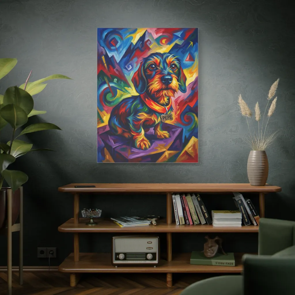 A bold, chromatic marvel! This neo-expressionist piece innovatively merges traditional portraiture with digital vibrancy and cubist elements. Its experimental aesthetic creates a truly modern, captivating pet art experience.