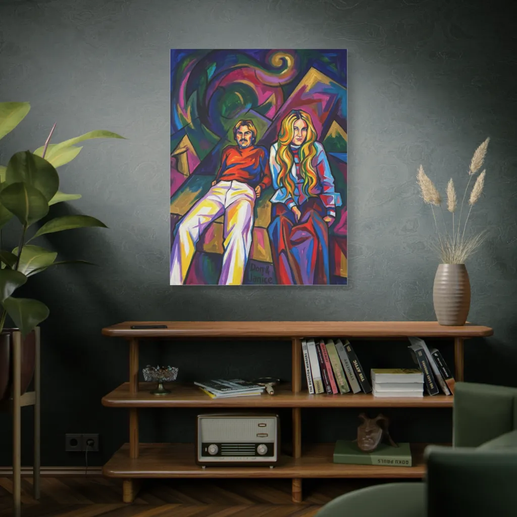 Bold, geometric pop art captures a cool 70s couple, radiating a vibrant, groovy, and slightly mysterious mood. Don and Janice, steeped in psychedelic geometry, look absolutely ready to drop the grooviest 70s album of the decade.