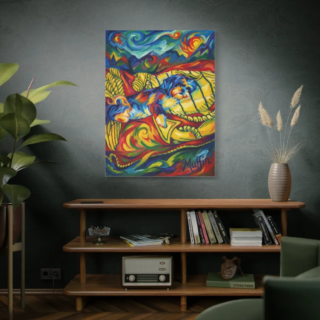 Muffin's 'Reverie' showcases a visceral chromatic juxtaposition. The swirling brushwork achieves tonal harmony, an avant-garde ode to canine somnolence. A true masterpiece; utterly compelling, if only one could purchase such a Louvre-worthy vision.