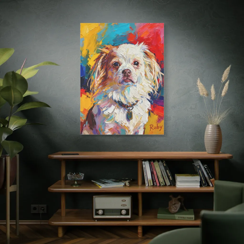 Thick, expressive impasto immortalizes an endearing dog's soulful gaze in a playful explosion of color. Ruby's impasto fur practically wags with vibrant personality and a hint of canine mischief.