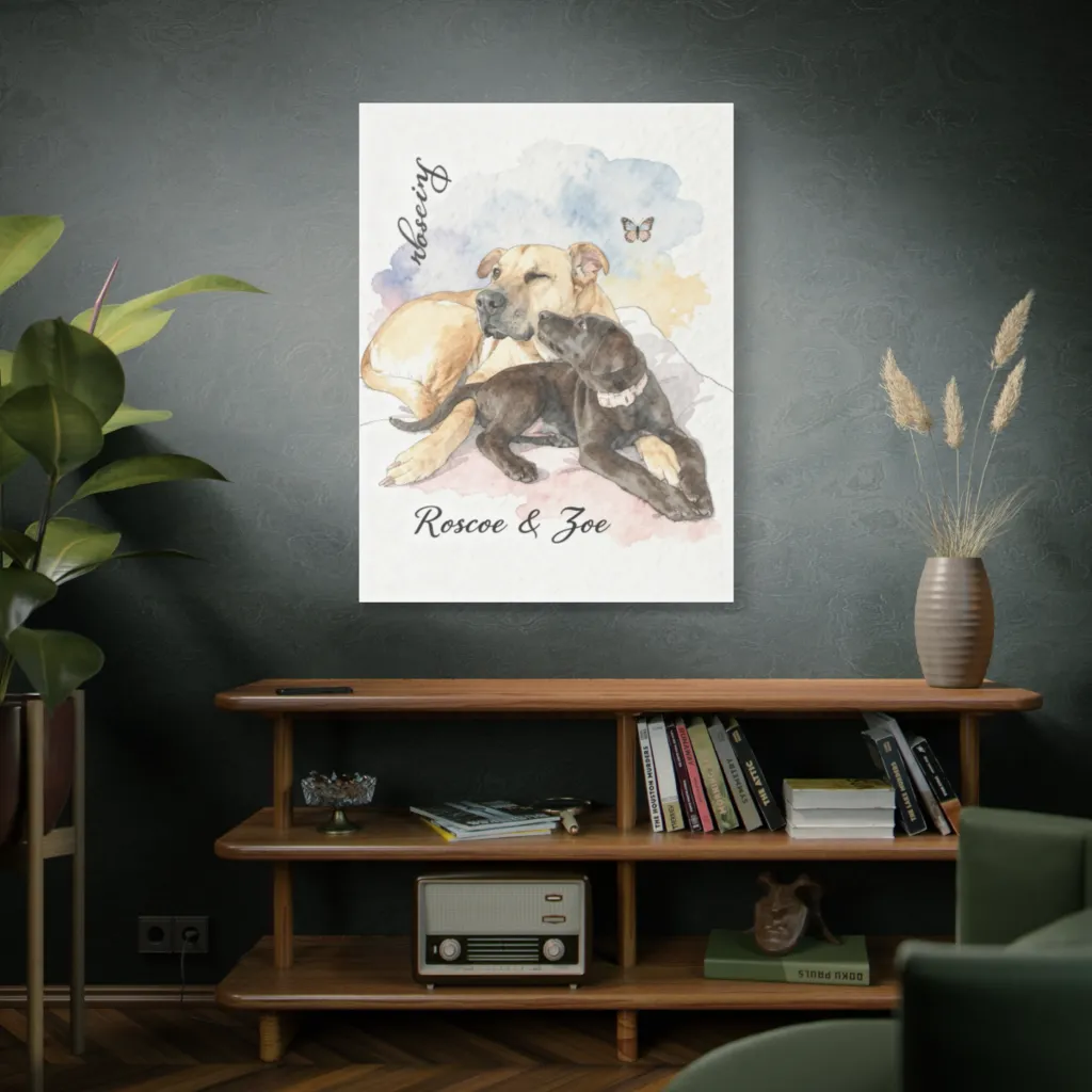 This watercolor beautifully captures Roscoe's cheeky charm and Zoe's devoted gaze, truly revealing their loving bond. A tender moment, their unique personalities shine through every brushstroke.