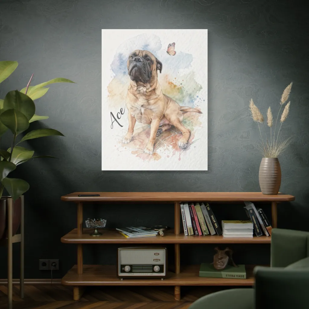 Luminous watercolors capture a serene, wrinkly dog's upward gaze at a delicate butterfly, evoking a playfully tender mood.