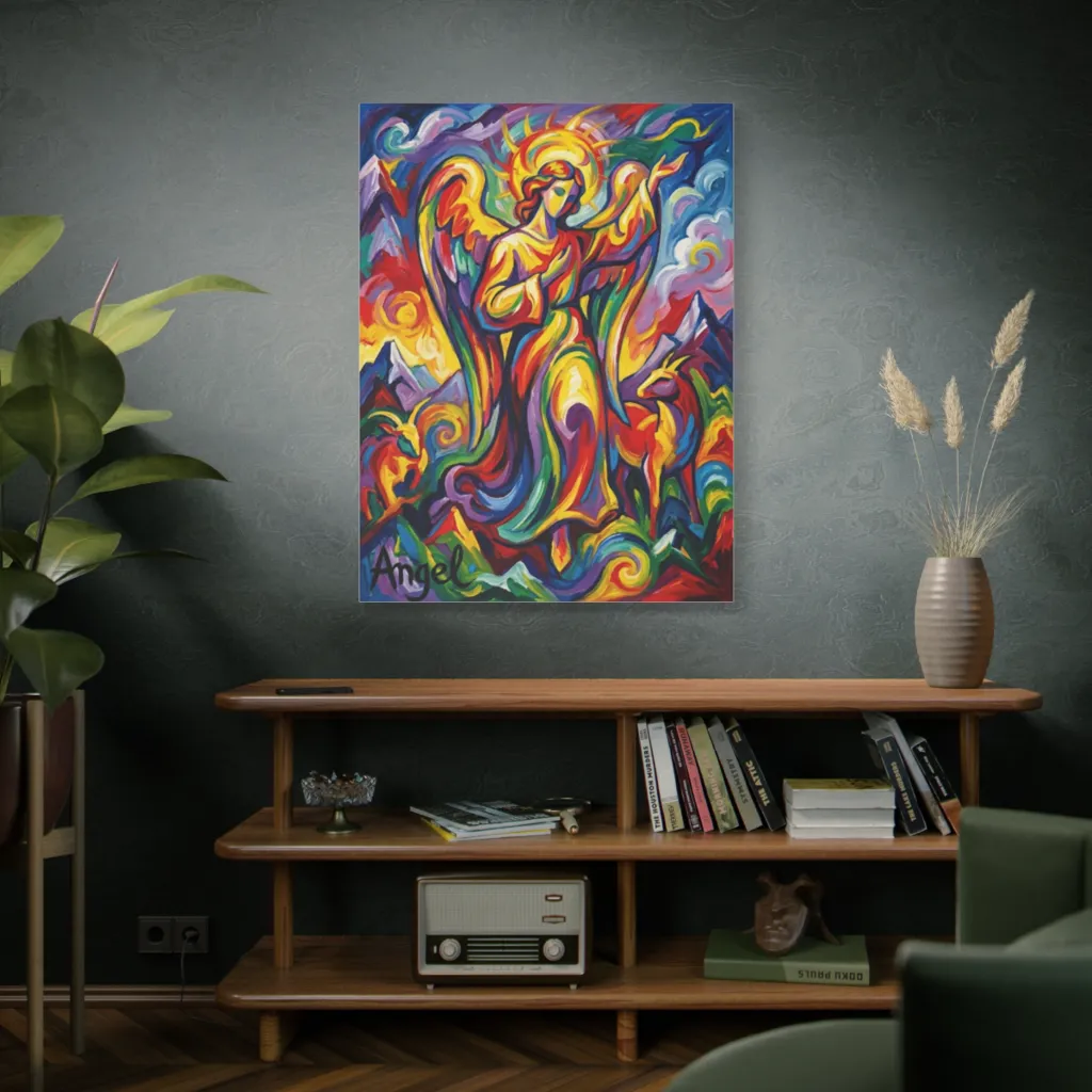 Angel's cubist form explodes with joyful, high-saturation hues. The chromatic harmony between warm mountains and cool deer captures pure vivacity. A masterclass in emotional resonance through vibrant color theory, truly radiating 'mountain radiance' - brilliant!