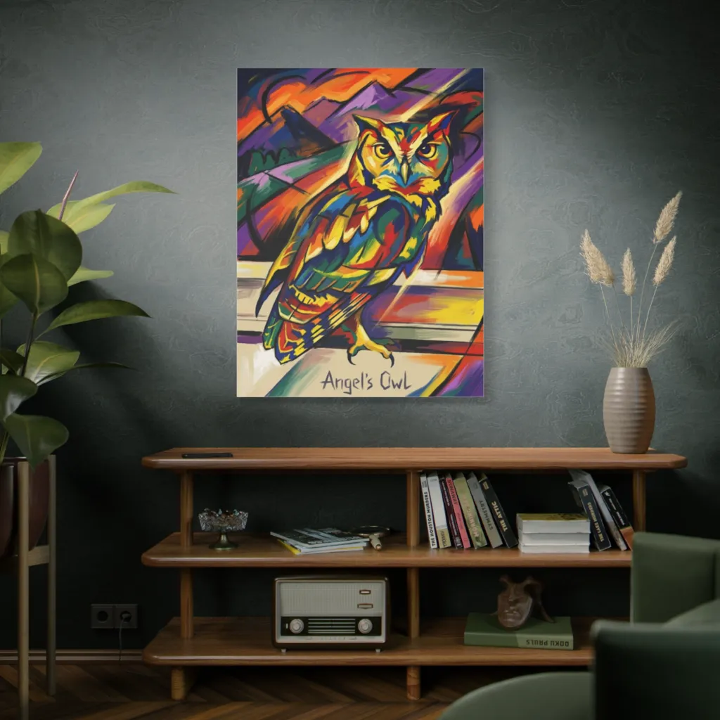 This vibrant, cubist-inspired owl, painted with energetic strokes against an abstract landscape, radiates a majestically watchful and dynamic mood. Angel's Owl, a kaleidoscope of nocturnal wisdom, seems poised to illuminate even the darkest art collection.