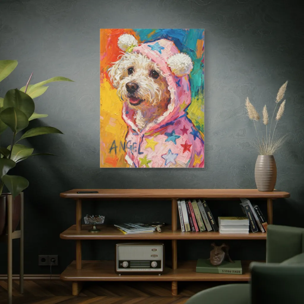 This piece brilliantly merges impasto texture with a contemporary digital aesthetic. The starry hoodie is a bold, innovative twist on pet portraiture, making traditional charm feel fresh and utterly modern.