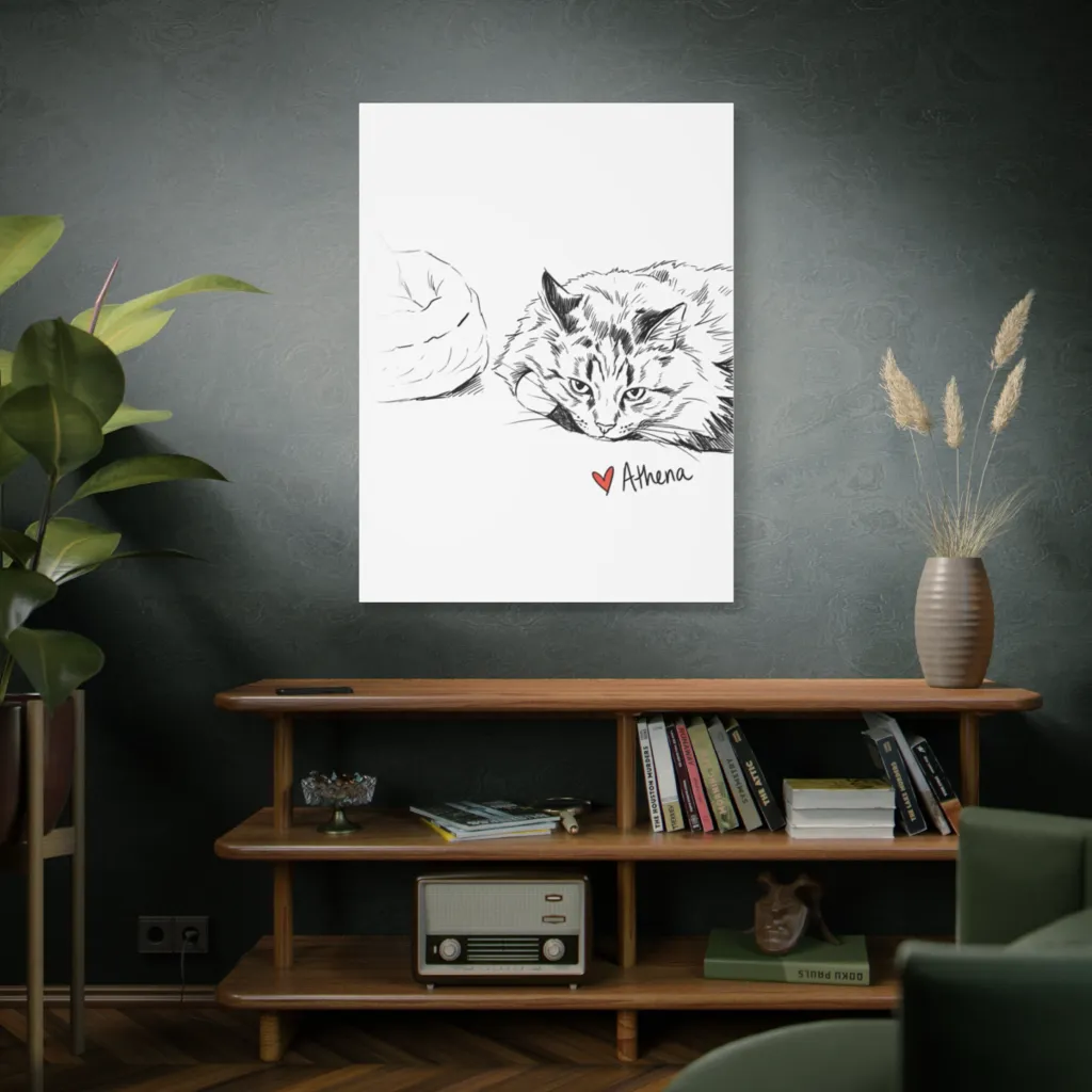 Expressive line art depicts a floofy, watchful cat named Athena, exuding calm yet playful charm.