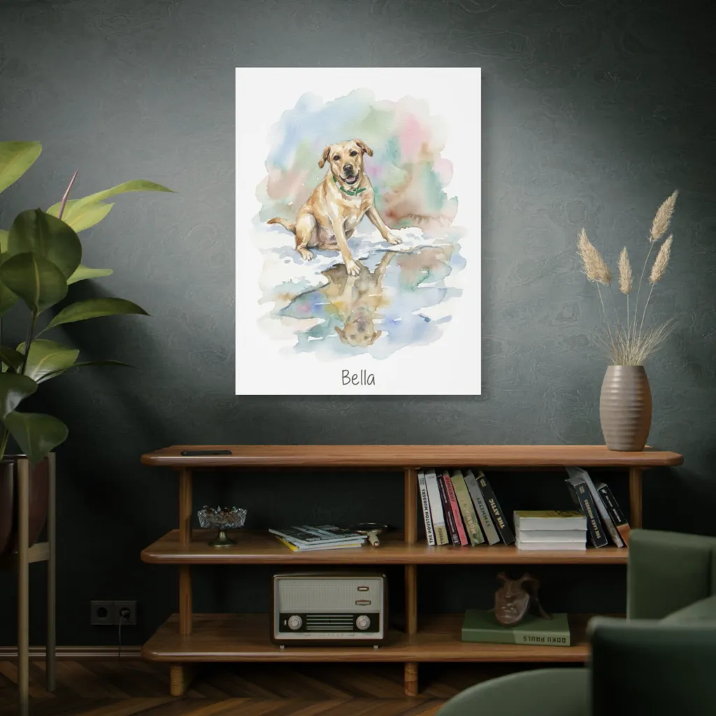 A luminous watercolor captures a joyful yellow Labrador reflecting happily, radiating whimsical delight. Bella gazes playfully at her watery twin, doubling the charm.