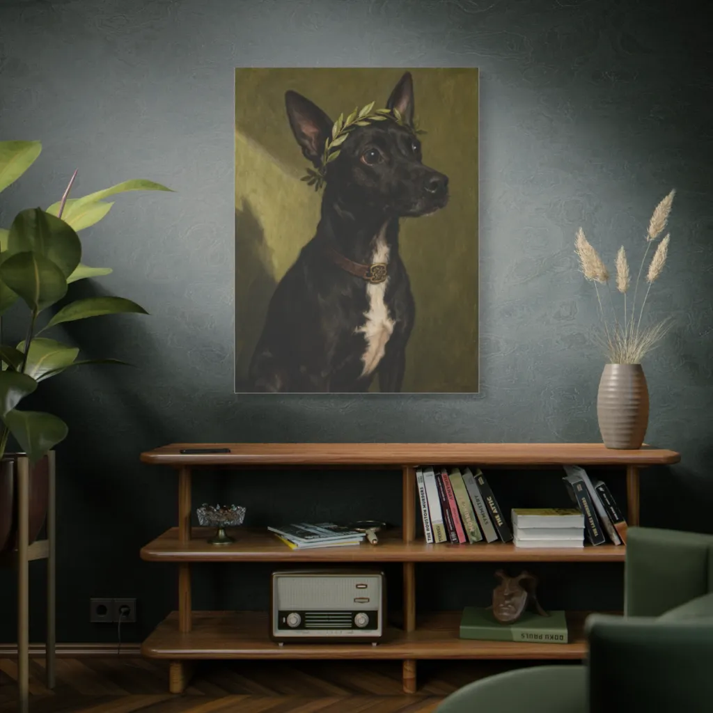 A masterfully painted classical portrait of a dignified black dog in a laurel wreath, exuding charming nobility with a touch of playful whimsy.