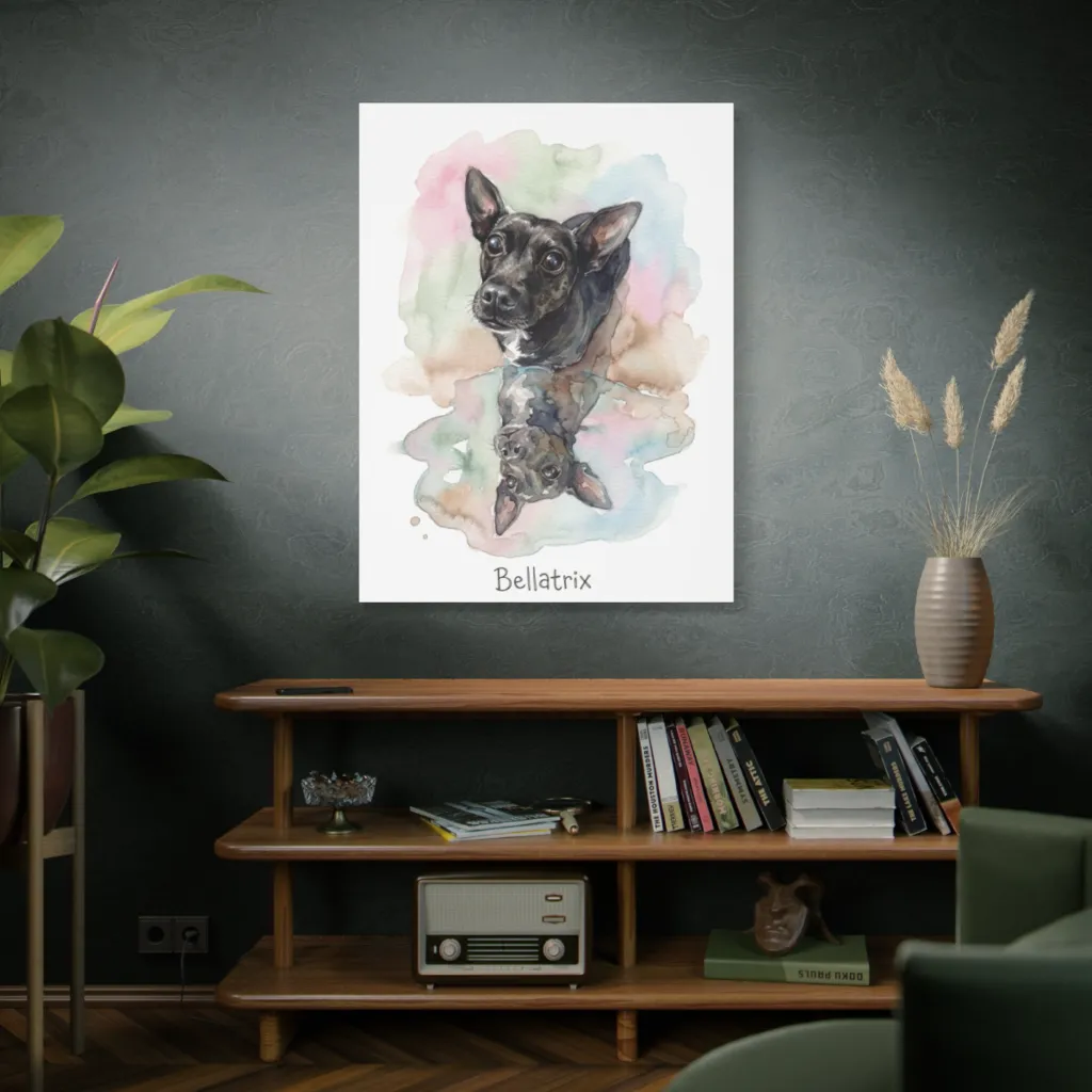 A charming watercolor captures a wide-eyed dog and its reflection in a pool of soft color, radiating innocent wonder. This Bellatrix is more likely to conjure treats than curses with those sweet, reflective eyes.