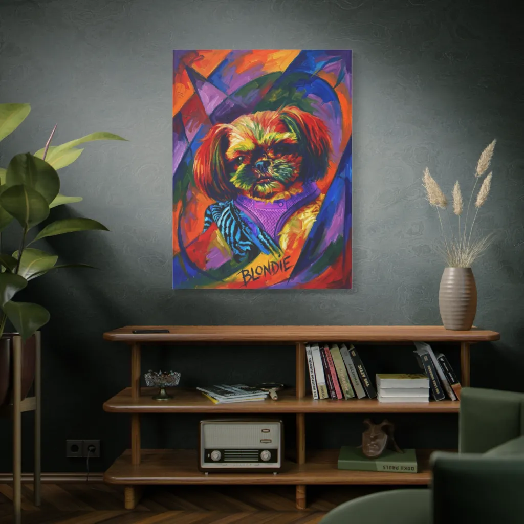 This vibrant impasto portrait of a rainbow-hued pup radiates electric, playful energy with a bold, abstract twist. Blondie's vibrant coat suggests she's ready to belt out "Heart of Glass" at a new wave dog park.
