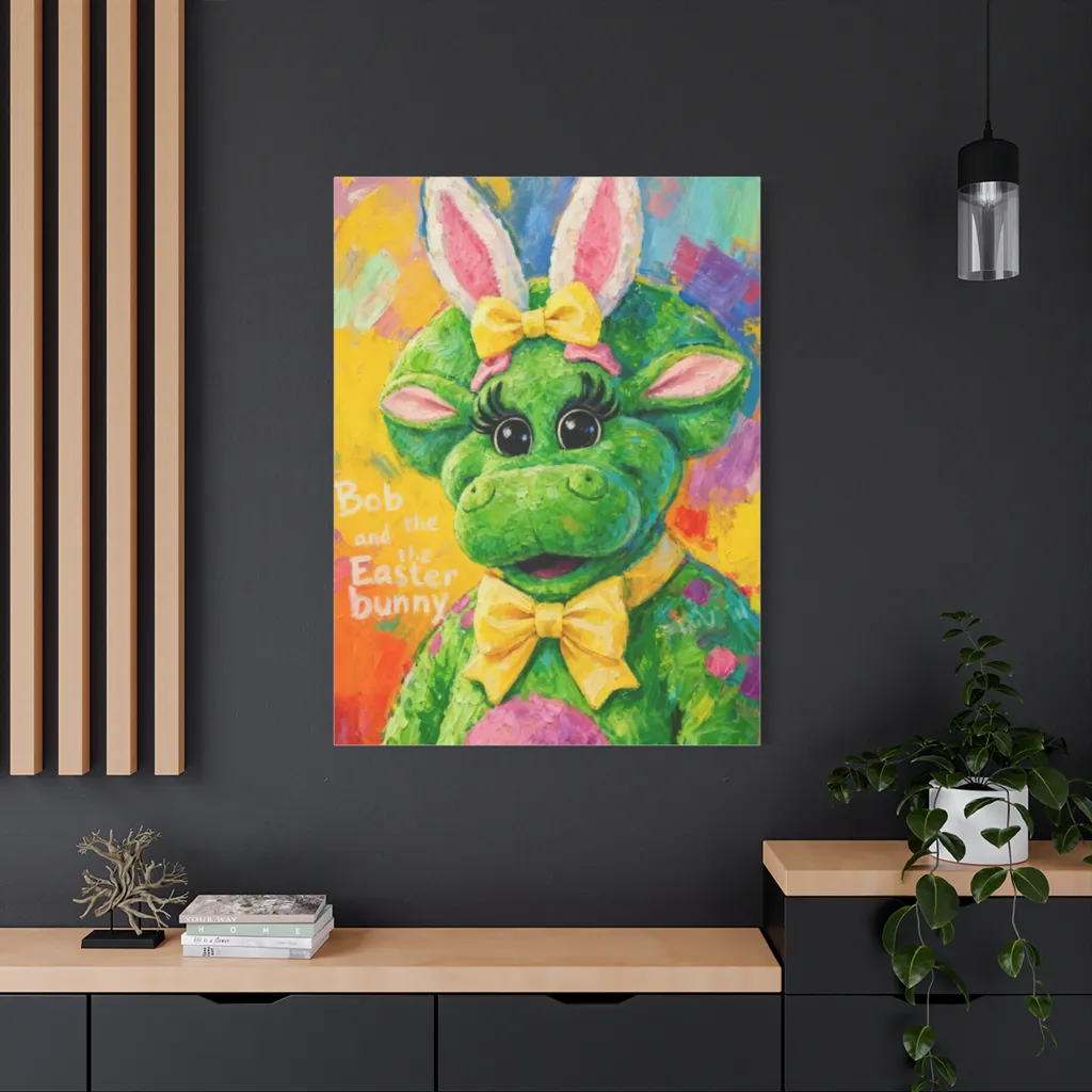A vibrant impasto portrait renders a playfully costumed, wide-eyed dinosaur radiating surreal Easter joy. Bob, surprisingly suited as a lush green Easter bunny, bats his lashes for an absurdly charming holiday.