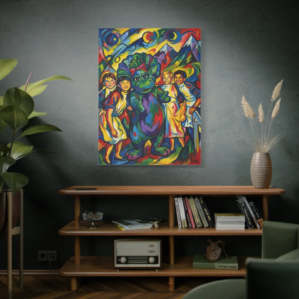 The vivid mountains and beaming dino burst with chromatic harmony. Bold, saturated primaries evoke pure, unadulterated "Bop fun," balancing warm energy with cool, expressive peaks. Brilliant!