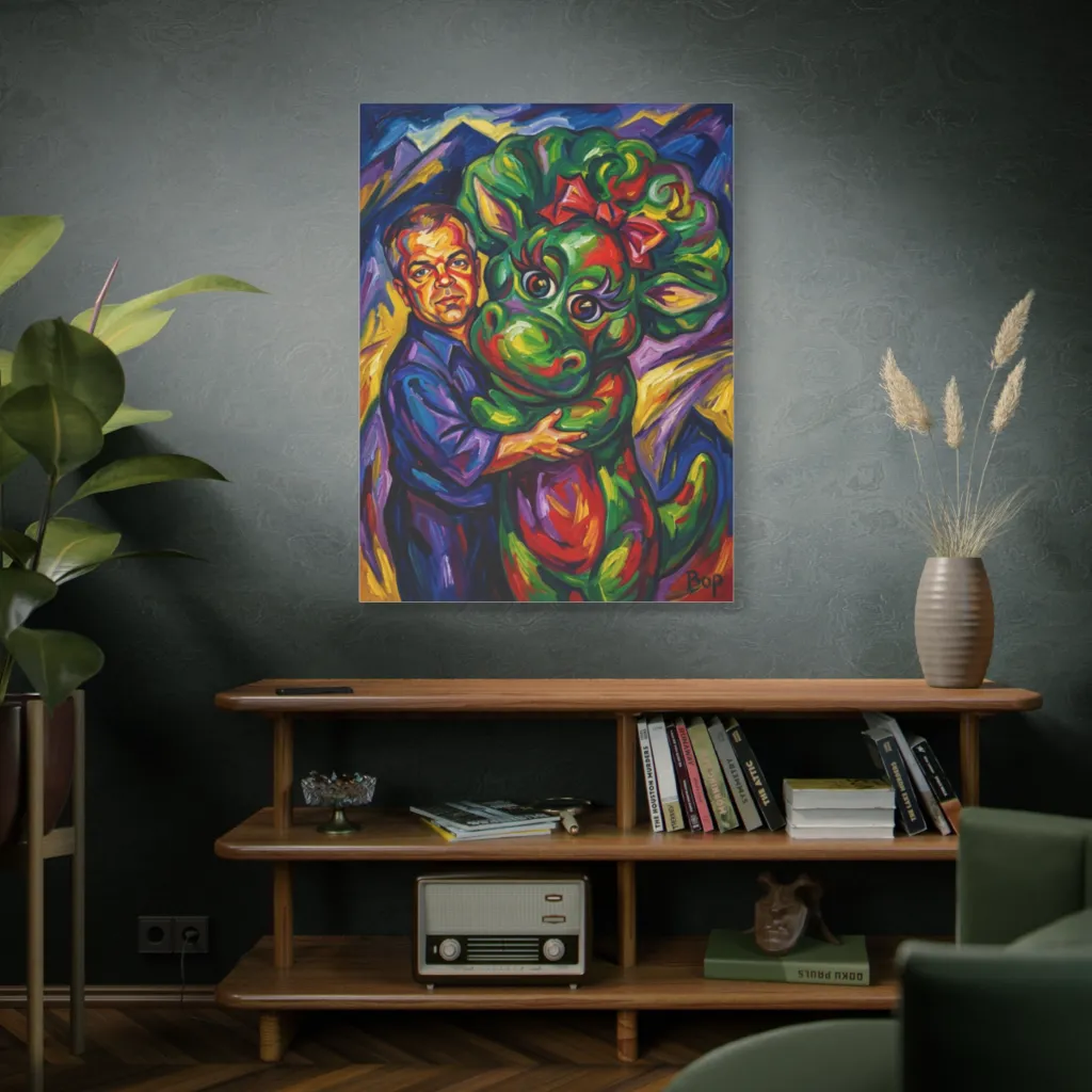 "Bop's Verdant Companion" brilliantly merges traditional portraiture's warmth with a bold, digital-age expressionism. The vibrant green creature against serene lines is an innovative, experimental fusion, creating a captivating, future-forward aesthetic. Truly cutting-edge.