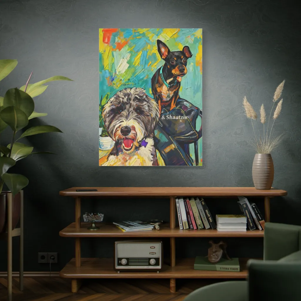 The vibrant impasto and joyful spirit of 'Bowen and Shautzie' demand a spotlight. Imagine it above a sleek, raw oak console in a sun-drenched breakfast nook, complemented by brushed brass accents. Pure chic delight!