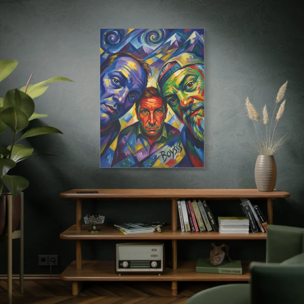 "Boysss' Mountain Rhapsody" presents a visceral cubist juxtaposition of form and exuberant canine glee. The audacious palette and geometric precision elevate this selfie to an avant-garde masterpiece, challenging pet portraiture's very essence. Truly profound.
