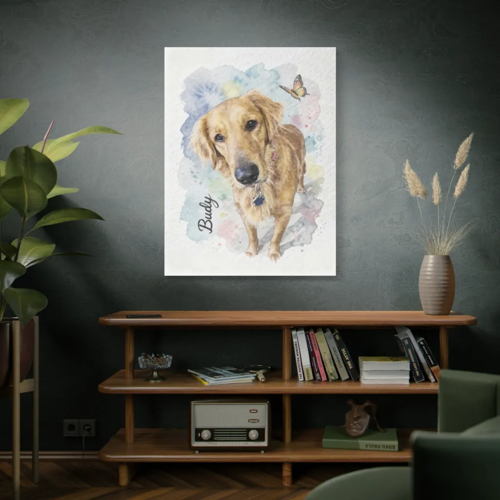 Loose watercolor strokes capture a golden retriever's curious gaze at a butterfly, radiating a delightfully whimsical warmth. Buddy's soft gaze clearly wonders if that fluttering friend is a new playmate or a particularly pretty snack.