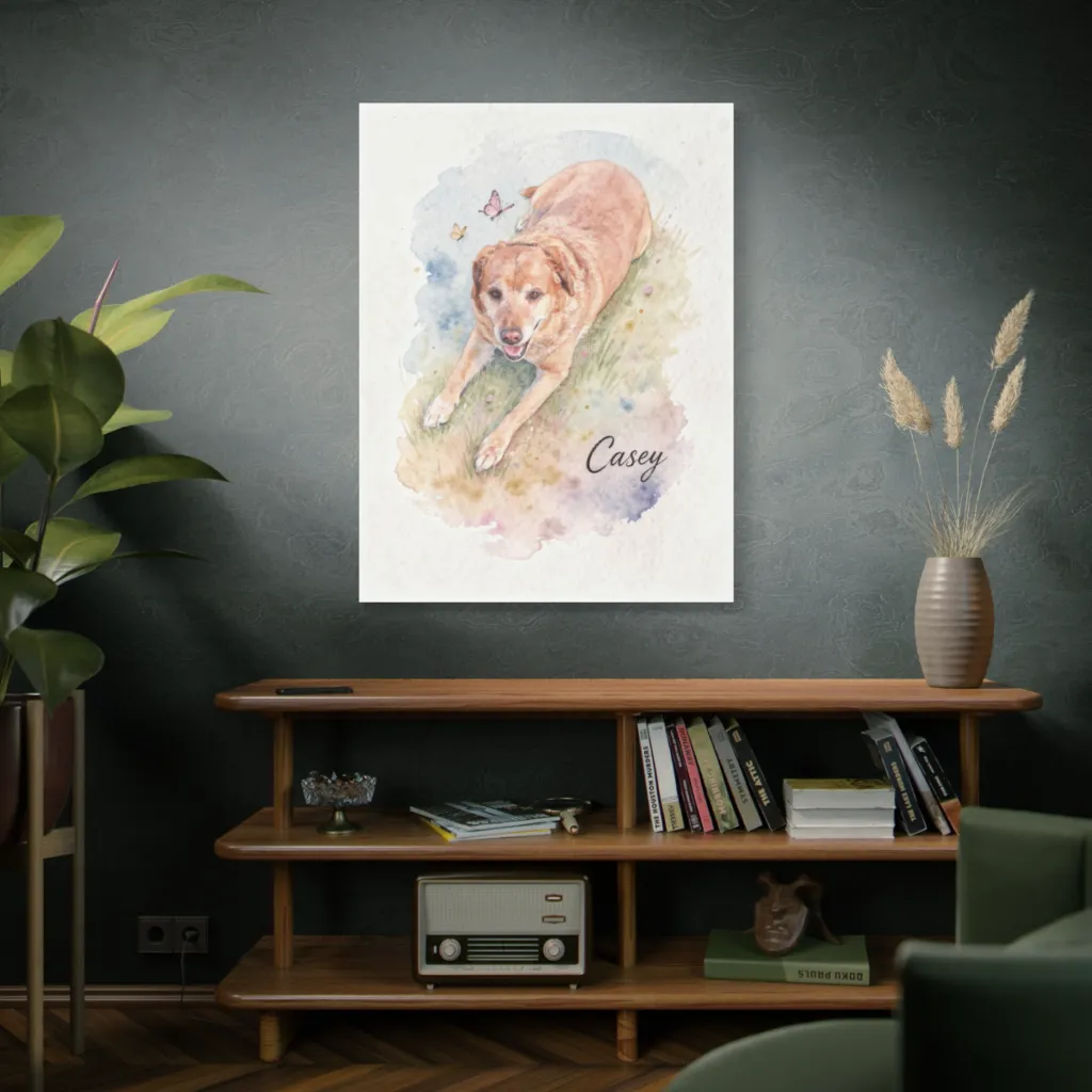 A truly innovative blend! This piece uses traditional watercolor techniques to evoke a modern, dreamlike digital aesthetic. The whimsical butterflies are a bold, contemporary touch, pushing pet portraiture boundaries.