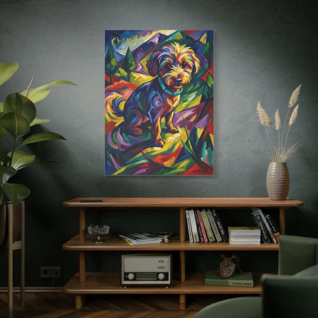 Bold, expressive strokes render a delightfully vibrant dog amidst a cheerfully fragmented landscape, radiating playful energy. Chewy, a walking rainbow of vibrant hues, looks ready to leap from this canvas and into a world bursting with color.