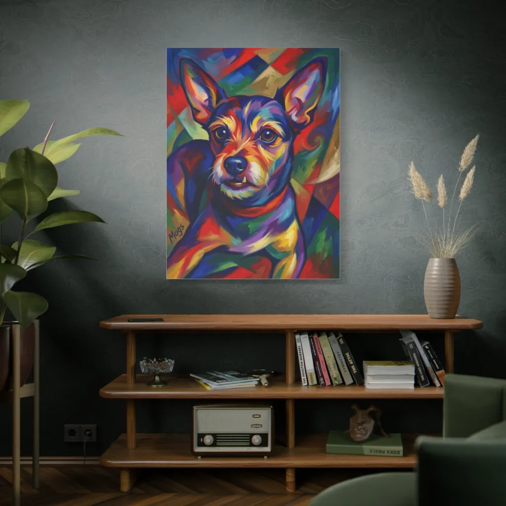 "Chromatic Portrait of Mogs" daringly juxtaposes pop-Fauvist geometry with visceral, electrifying color. Mogs' winking presence, a triumphant avant-garde canine, achieves a truly audacious tonal harmony. Masterful.