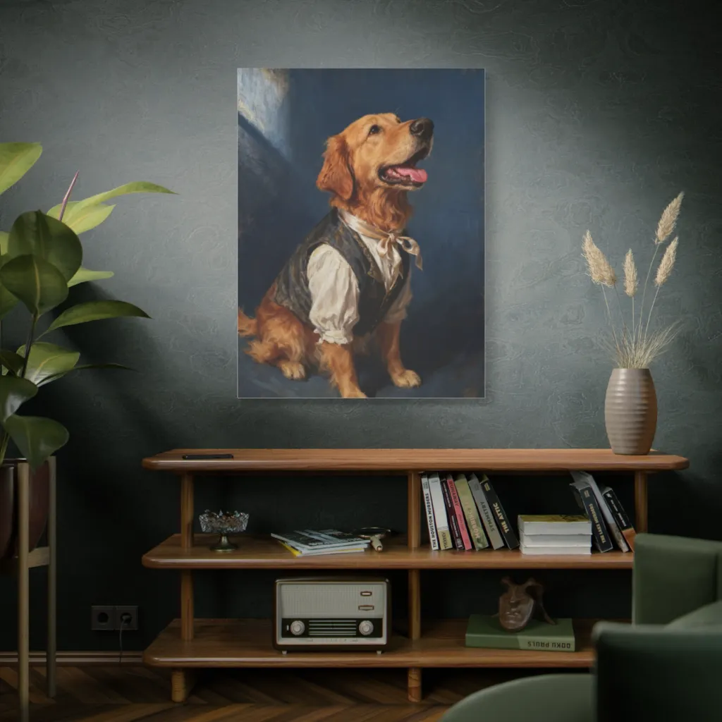 A masterfully painted, regal golden retriever in period finery looks expectantly upward, embodying whimsical nobility and charm.