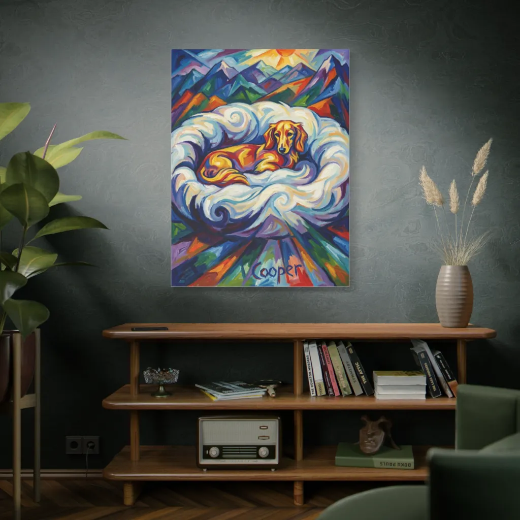 "Cooper's Golden Slumber" masterfully juxtaposes visceral brushwork with an avant-garde spectrum. The dachshund's presence, nestled in tonal harmony, elevates this beyond mere pet portraiture to an evocative statement on dreamscapes. A true marvel.