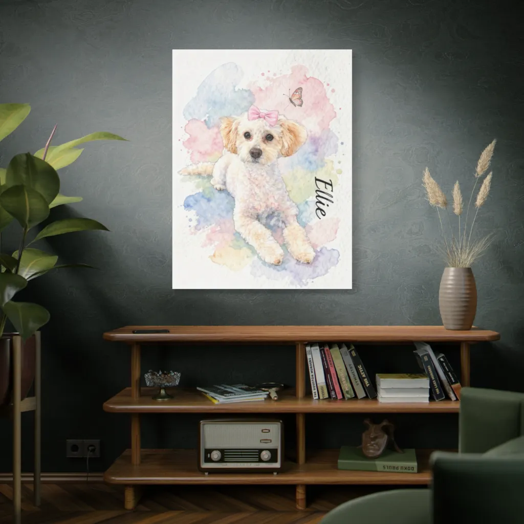 Ellie's Pastel Reverie exhibits a masterful tonal harmony. The whimsical watercolor brushwork juxtaposed with that evocative, almost visceral, pink bow elevates this canine portrait to an avant-garde delight. Truly sublime.