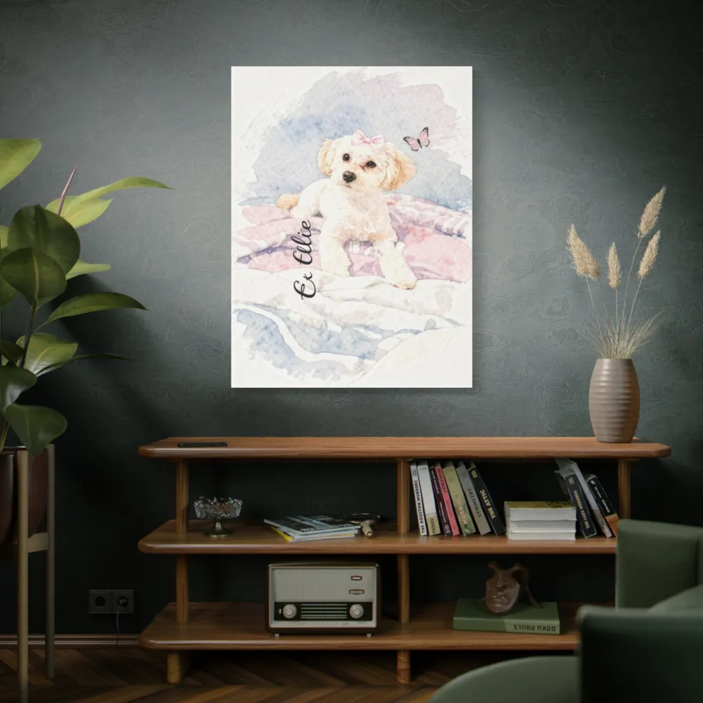 Soft watercolor washes capture a charming, bow-adorned pup and butterfly, creating a dreamily sweet and whimsical scene.
