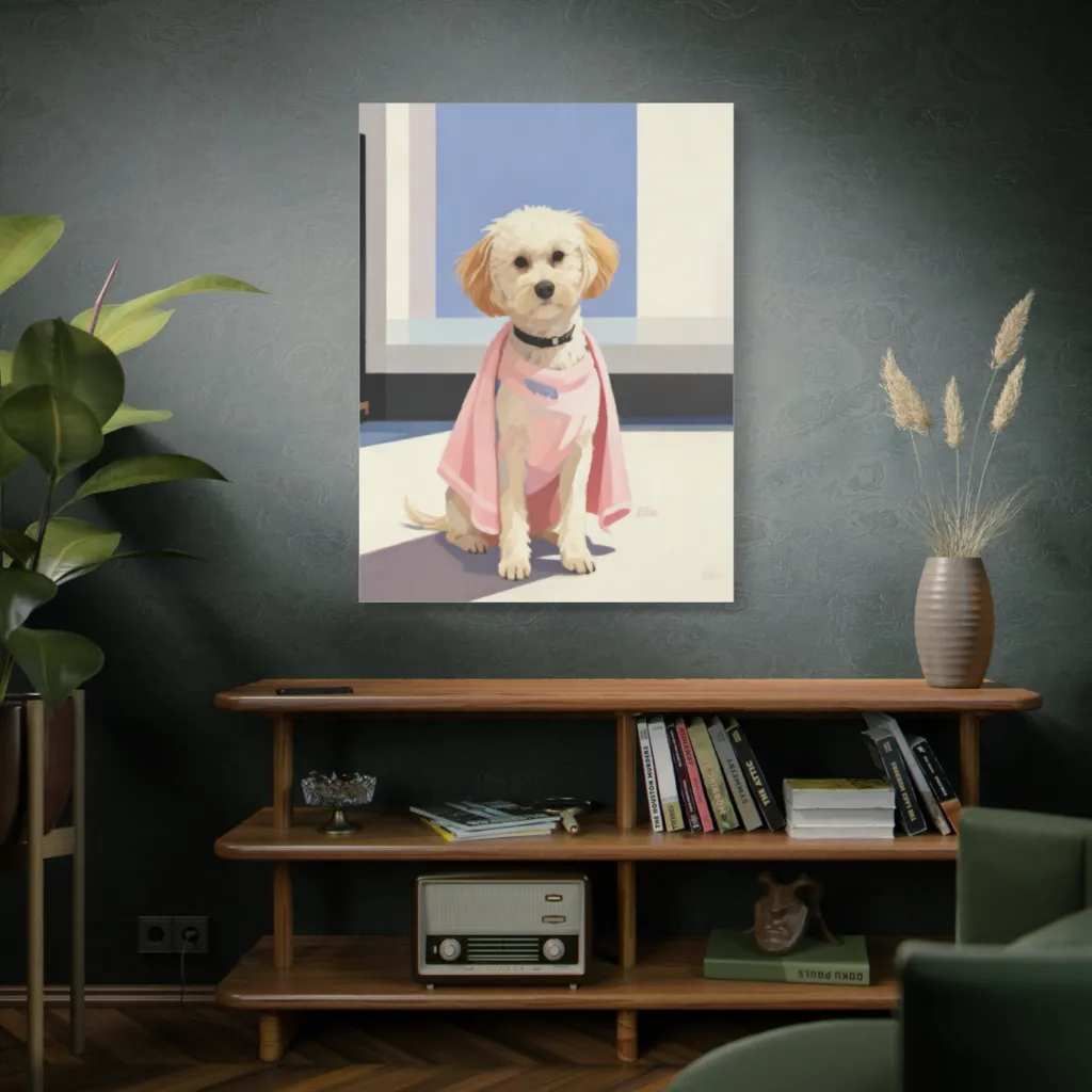 This crisp, bright portrait captures a fluffy dog's endearing superhero pose with playful charm against a minimalist backdrop. Our caped canine wonder, Ellie, strikes a pose, clearly ready to save the day (and steal your treats).